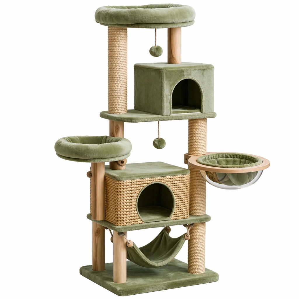Árbol para gatos con estructura principal de madera y postes cubiertos de sisal natural. Incluye tela de poliéster en los cojines y plataformas, ofreciendo varias áreas para jugar y descansar. Cuenta con una cueva de ratán, una hamaca de tela, juguetes colgantes y un cesto de observación con borde de madera y base de vidrio templado. La altura total es de 145 cm y la base mide 60 cm x 45 cm.